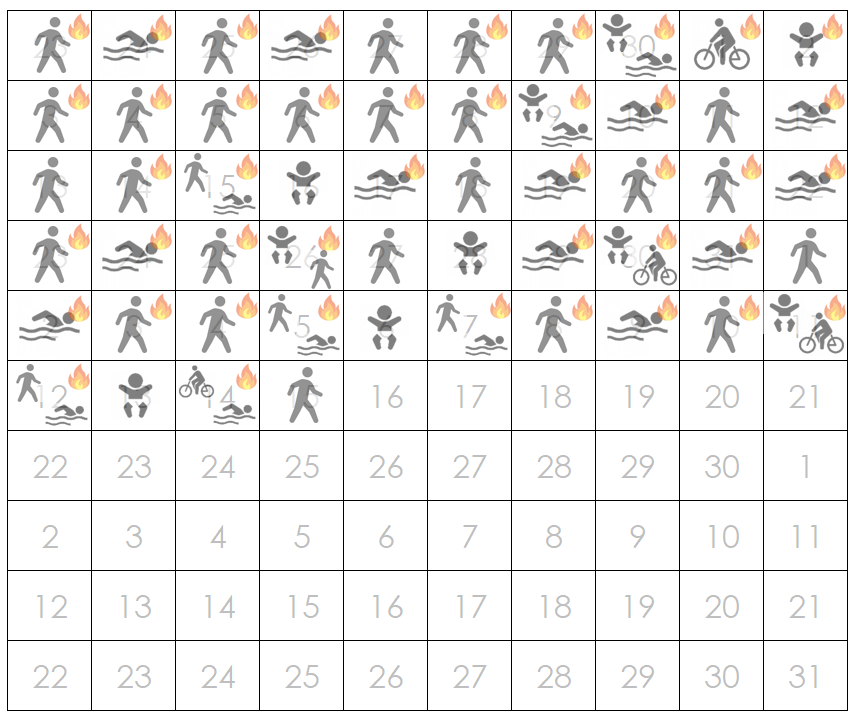 まず運動。 週2日のベビースイミング(50分)に加え週3日のジム通い(2時間半)継続しております!!!!!! 残りは友人と遊びに行くとか、少し遠くのショッピングモールに行くとか、自転車であっちこっち買い物に行くとか、あの手この手で無理のない範囲で運動しております。 🔥マークがついてる日ががっつり運動した日、ついていない日は1日30分の最低限の運動の日。 こうやって見たらめっっっっっちゃ頑張ってませんか、私…(; ・`д・´)